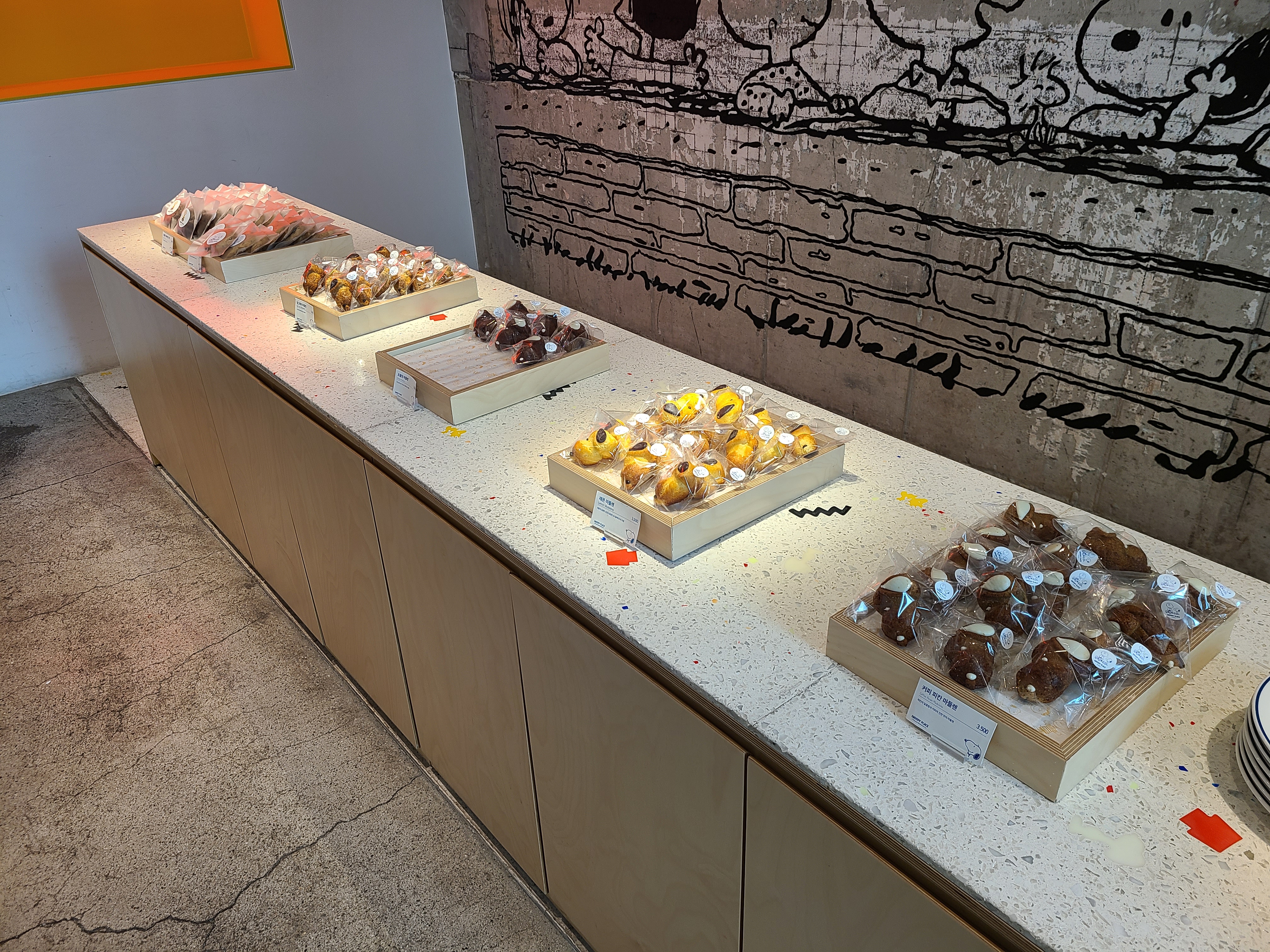 You can choose bread or Snoopy souvenirs and then go to the checkout counter to order coffee.